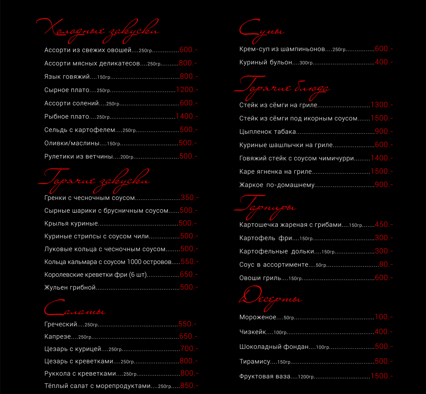 Благодаря отменной кухне вы сможете отведать изысканные блюда, сделанные волшебными руками наших поваров. Наш бармен угостит Вас своими шедеврами.